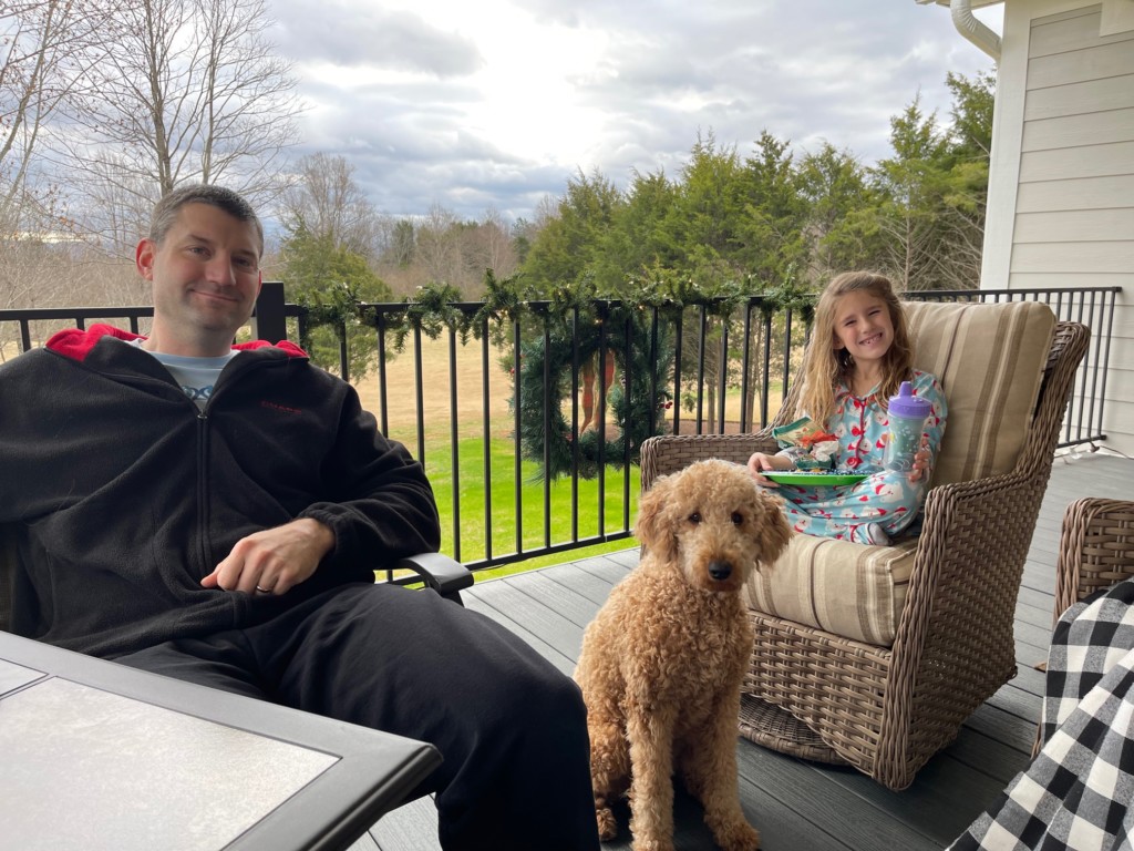 After we opened everything, it was time for another tradition, mimosas and my breakfast casserole I make every year. It was actually warm enough to eat on the back porch.