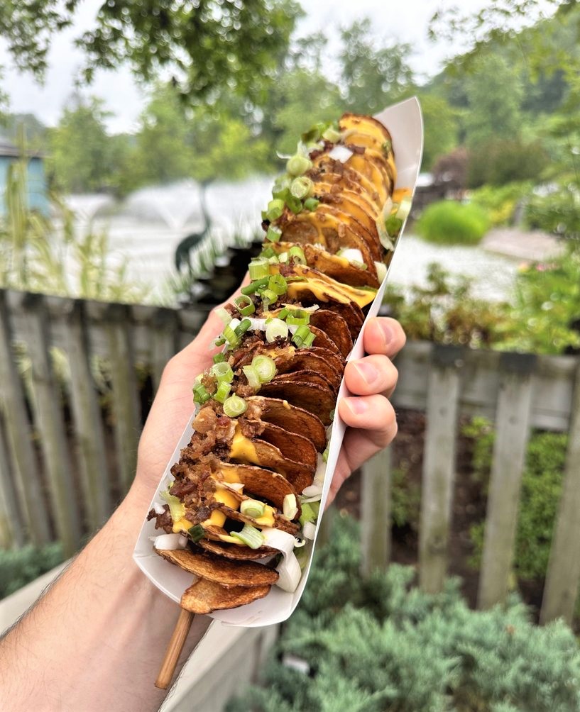 - Loaded Potato Tornado: Get ready to spiral into a world of flavor with the Loaded Potato Tornado. Enjoy an innovative take on the classic spud as freshly cut potatoes are skewered, seasoned, and deep-fried to create a crispy, golden treat. It has a beautiful an dfun presentation, but was admittedly a little difficult to eat.