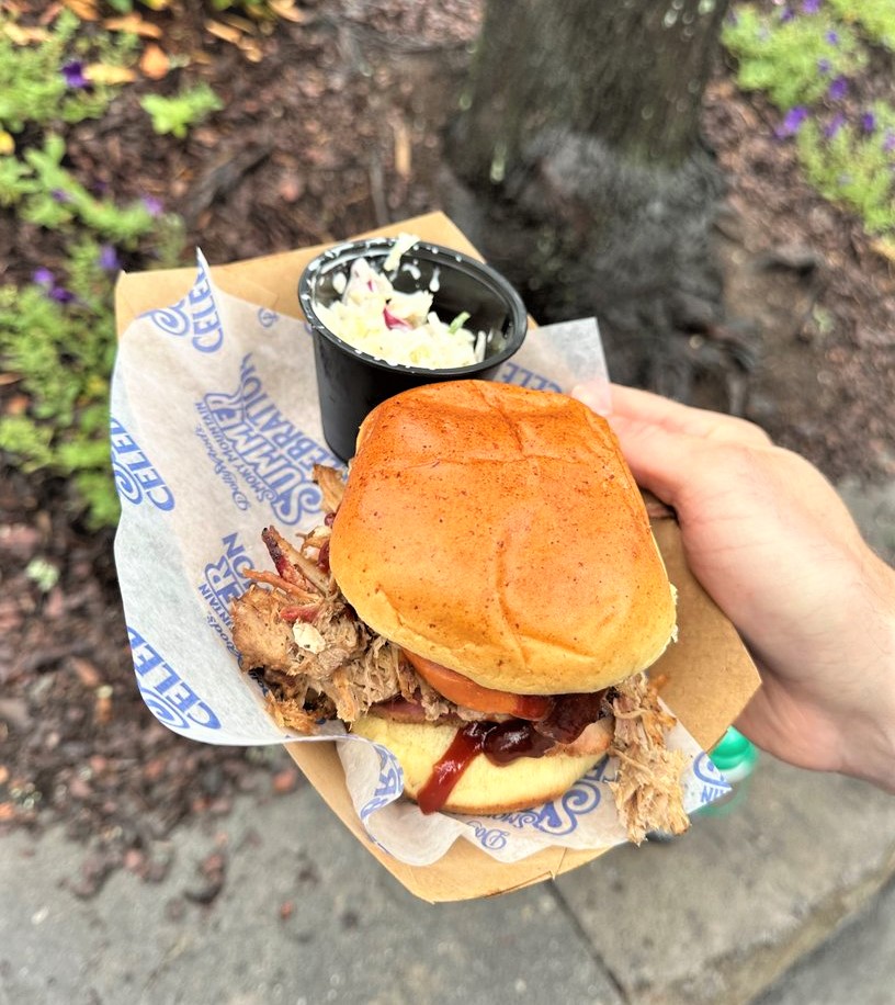 - Three Little Pigs Sandwich: Calling all barbecue enthusiasts! Head over and try the Three Little Pigs Sandwich, which contains roasted pork loin, pulled pork shoulder, and smoked sausage. You also get a side of slaw. With each bite, you’ll understand why this booth is a perennial favorite among visitors (and Bobby’s favorite of the day!)