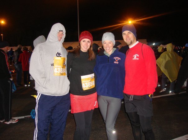 Since I live in Mississippi, I don’t own a lot, well, any “cold weather running clothes” Luckily, Jen let me borrow a pair of pants to wear under my skirt and a long-sleeved wicking shirt to wear as a layer. I also bought a nylon long-sleeved shirt from the running skirts girls and then wore a plain black sweatshirt on top to toss in case I got hot. I also wore a hat, gloves, and hot hands!