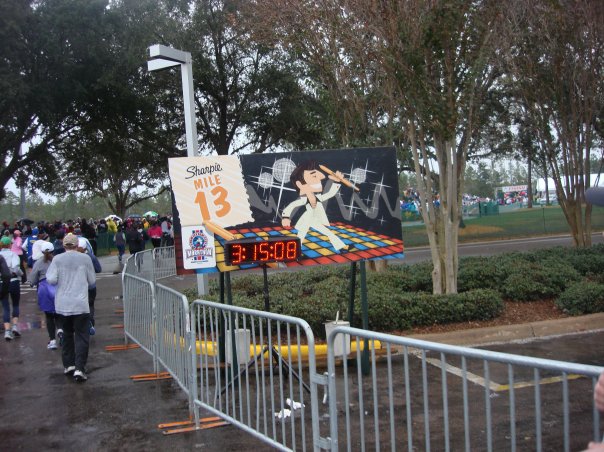 We made it into Epcot, and only had 1/2 mile to go. Bobby almost couldn’t finish, but I kept encouraging him telling him 3 tenths, 2 tenths, etc. (Garmin came in handy), and then we saw the mile 13 sign and the finish line!