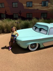 We took photos with all the vehicles of cars fame, just like we were standing in line for characters at the theme parks. She ran down the streets of Radiator Springs, and took a dip in the Big Blue Pool. (Note: there is a pool at the Cars section but it wasn’t as ‘hoppin as the main/Nemo pool.)