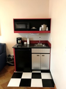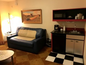 The sofa in the living room folds out into a bed for two, and there is a TV as well as a kitchenette complete with refrigerator, coffee pot, and microwave. They even had paper bowls and plates stocked and ready for us.