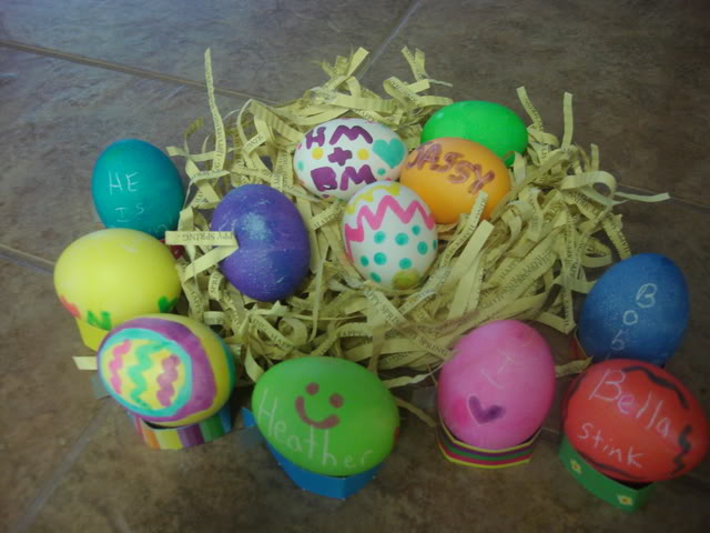 thanks! we got these new things this year, they were like color sticks, Q-tips with color inside and you could paint the eggs, it was cool!