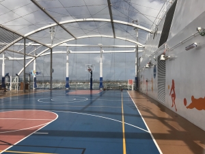 Up on the open decks, the Vista has a great sports and activities area. There was a huge caged in basketball court, and even though we never had the chance, we saw where they play volleyball up there, too!