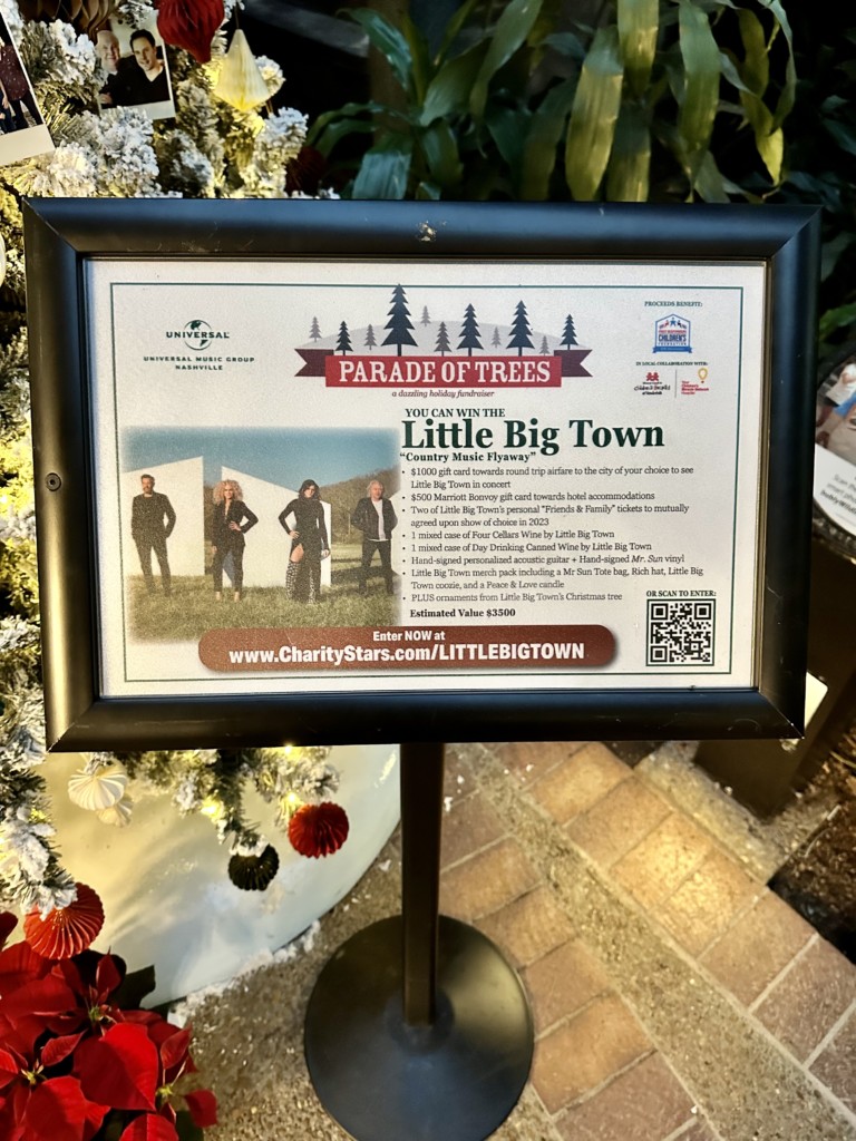 Parade of Trees: The atriums are adorned with gorgeous trees decorated by different country music artists. They are auctioning them off for charity, which I just love! You can get more information on this website or on the instagram accounts @umgnashville, @charitystars, @1strcf, and @vumchildrens