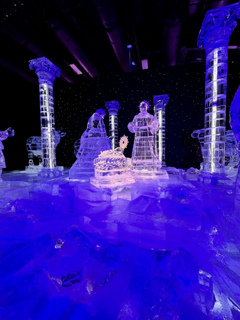 ICE! is back!: When you purchase tickets for ICE, you are given a specific time to come to Pinetop and enjoy the experience. Dress warmly, it is 9 degrees inside! However, you are given an oversized parka to borrow, which easily fit over my winter clothes. (We also brought hats and gloves, and they helped a lot!) After you don your parka, you get to take a stroll through ICE and can stay and enjoy at your pace. There are SO many scenes from the movie, and we loved it! At the end there was a fun slide made of ice you get to go down, which was silly and fun to do and see others doing! Our favorite part was the end, where there was a gorgeous ice nativity scene. It was truly spectacular. These ice carvers are SO talented! I don’t want to spoil it too much so will just post a couple photos.