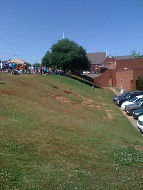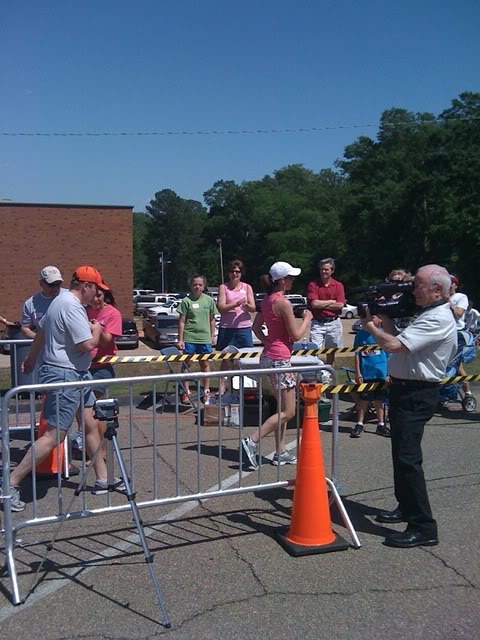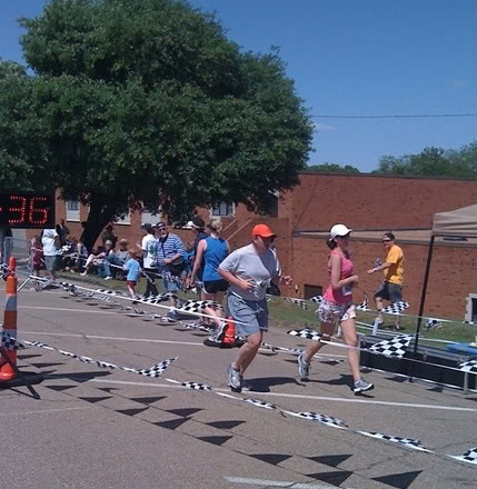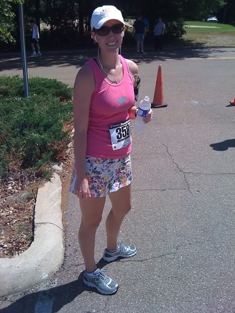 It was a small race, it was the first time this church has done it, and it was to raise money for special needs kids. There were a good amout of March of Dimes people too, so I am glad they all got to come run. I was really nervous to start because I knew the conditions were rough and as I said, I didn’t know the course. The gun went off, and off we went! I started off really well. A little too fast, but really well. I was between a 7:20 and 8:15 pace for the first 8 or 9 tenths of the first mile, I felt great, I was happy, it was all good. Then, we turned a corner, and in front of me was the most giant, long, hill I have ever run up. I. wanted. to. cry. I knew my hopes were gone, because I knew the whole race would probably be like this…and it was. the last tenth of two slowed up my average of my first mile to an 8:45. Still great, but I knew with the heat and hills I couldn’t sustain it. I made it up the hill, grabbed some water at the water station, and kept going. I turned another corner….another hill. I pretty much gave up at this point. I mean, I knew I would finish the race, but I knew I wasnt going to ahve a good time, so it was kind of like what’s the point in killing myself. So I just putt putted along at a training pace, going up and down the hills. I later found out after plugging my garmin into my computer the two biggest hills had us going from a 300 ft. elevation to an over 700 ft elevation!!! there were about 3 other “minor” hills and a lot of ups and downs, but I finished.