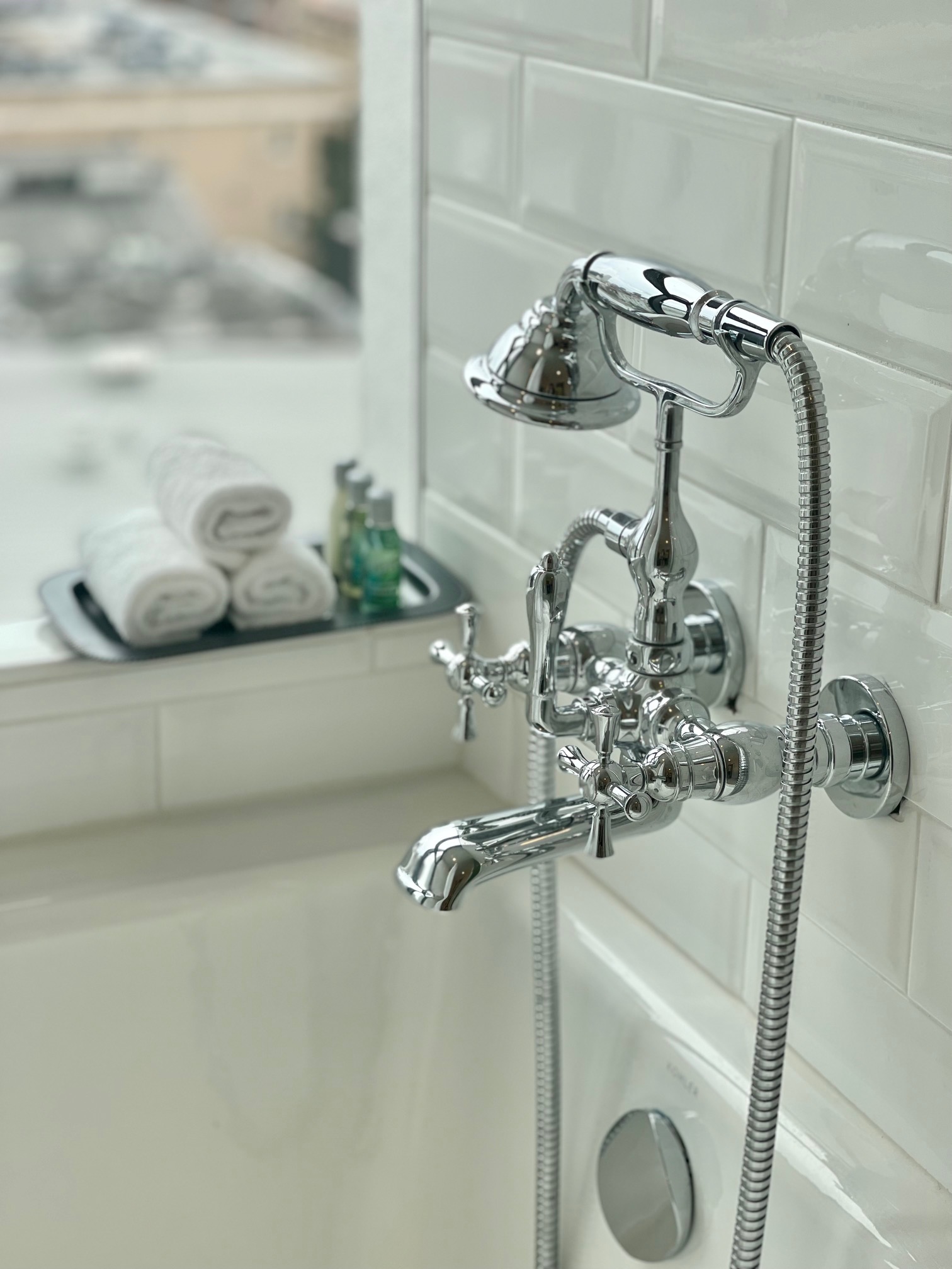 I felt so fancy in the gorgeous decorated New Orleans-style guest room! We had a corner deluxe room with a great view of the WWII Museum right across the street. We had a spacious bathroom complete with a coffee bar and makeup vanity, as well as a gorgeous tub with sweeping views of the city.