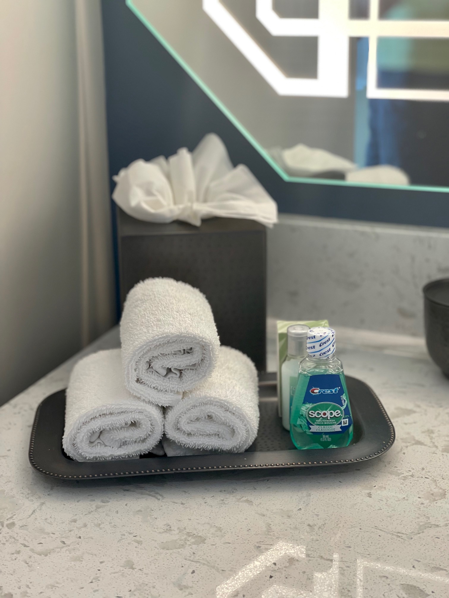 The bedroom had huge windows, and we loved having a king bed! A desk also came in handy since my husband had to work and brought his desktop computer. There was a large TV, a mini-refrigerator, and even a tablet by the bedside that acted as an alarm clock had information about the hotel, and even was a remote for the TV!