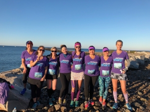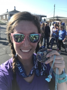 I got dressed, ate breakfast in my room, and headed to the lobby to meet my teammates. This is when I realized it was 43 degrees outside and was thankful I had packed accordingly. We all hurried into the team van and off we went to the starting line. We made it to the runner drop off area, which just so happened to be by the water, so of COURSE we had to take a group photo.