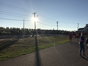We finally got our act together and walked to the start line, only to discover there were VERY few port-o-potties and a line well over 100 people long. I decided I was just going to have to hold it, as they were lining people up and then singing the national anthem before I could really decide what I wanted to do. I hurried and turned on my Garmin and got Pandora working, and then we were racing! I was cold, but I have run enough races to know that I personally warm up very fast even when it’s cold outside and hate being miserably hot at a race because I overdressed, so I opted to wear a skirt, compression socks, and a throw away jacket over my team shirt, as well as something to keep my ears warm.