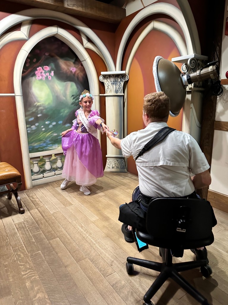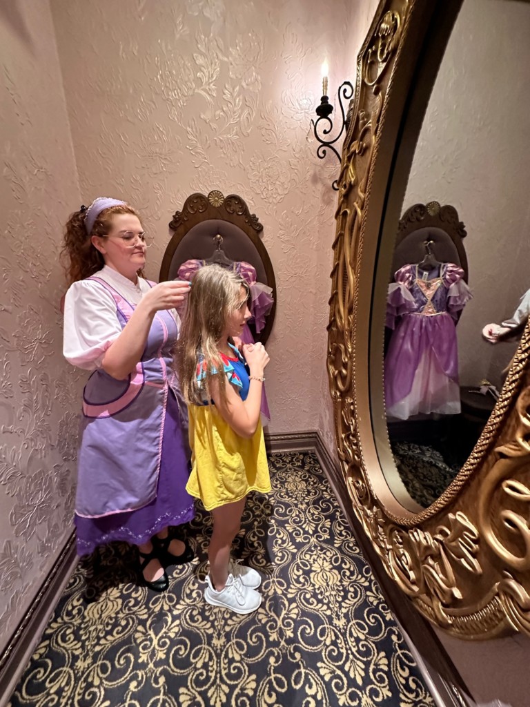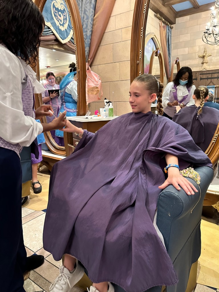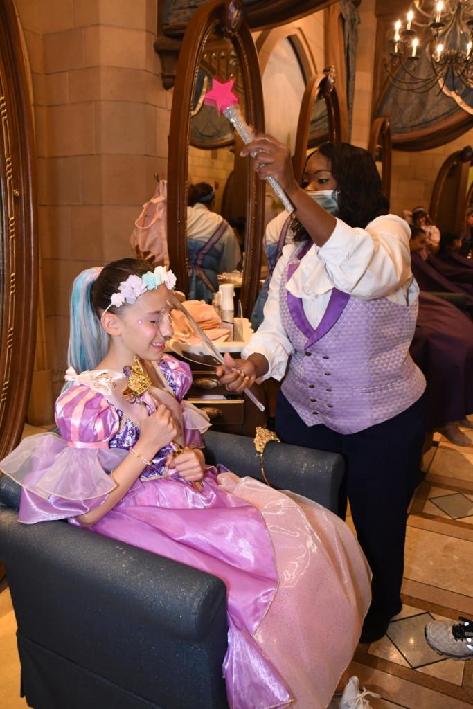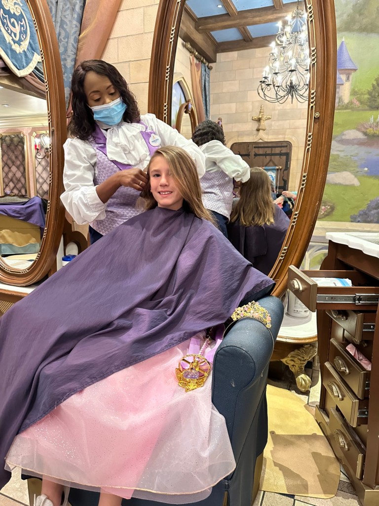 The cast member joined us and showed her the different hairstyles. I really wanted her to pick an adorable updo…but no…she wanted the one with pink and blue hair. I wanted this to be HER choice so I told her to go for it. The cast member asked to “take a look at her hair” and told funny hair jokes while playing with it. Heads up, they are discreetly looking for lice here. Don’t worry, it’s VERY discreet, Emma Kate had no idea and the CM never told me, I just knew from reading things online that they checked.