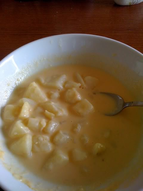 -pour out 3/4’s of the water, add evap. milk and cheese, garnish with salt, pepper, more cheese, green onions, etc.