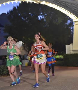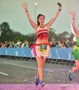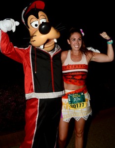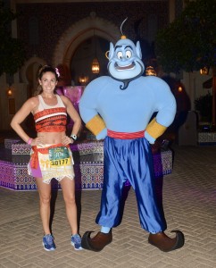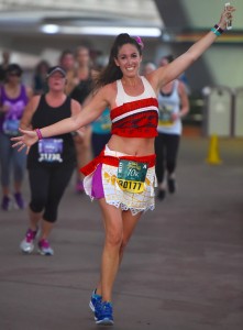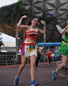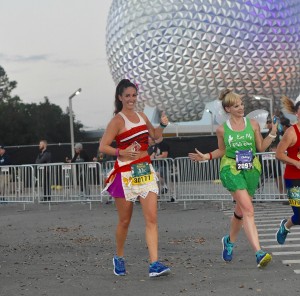Soon it was time for our wave to take off. My plan was to run a comfortably hard pace (so maybe about 75-80%?) and get ahead of some of the picture taking crowd, and then maybe have some short lines in EPCOT because of it. Honestly, the first three miles are pretty boring anyway, so Jen and I just chatted and passed the lines as we made our way to EPCOT. We had plenty of running room and there were only a handful of people around us which was nice. We got into EPCOT and stopped for the first time (for water) strike that—I stopped at mile 2 to rip off and throw away my grass skirt #CostumeIssues. It was driving me crazy. Seriously people, do as I say not as I do.