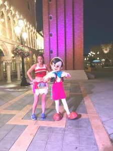 We grabbed water, I took an Insta story video, and we carried on around the World Showcase. I love how the torches are lit during this race! We came to a character stop, Pinocchio, and saw there were three people in line. I asked Jen if she wanted to stop, which she did, so the fun began!