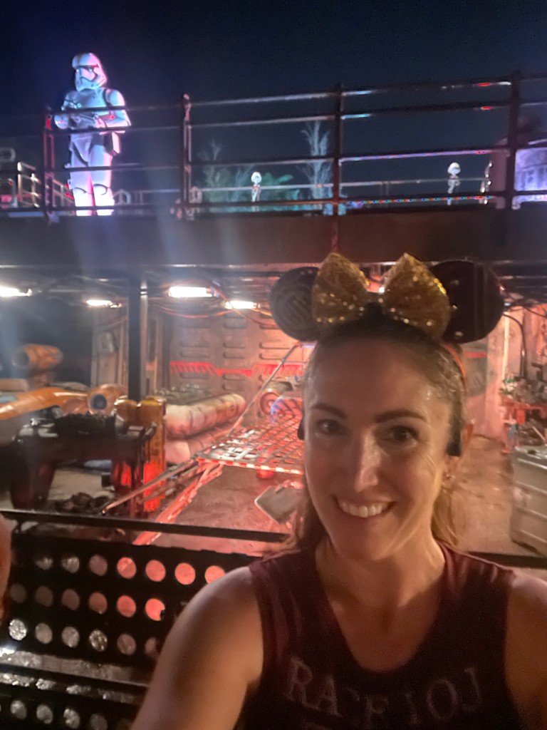 Running through Star Wars Land and Toy Story Land was a lot of fun in the dark! I was smiling the whole time and enjoying the awesome scenery around me. I stopped and took some video footage of this storm trooper for my Star Wars obsessed husband!