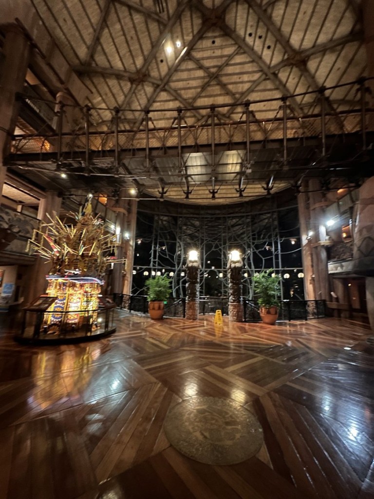 We woke up at 2:45, because we had to get on the bus around 3:30/3:45 I believe. I wasn’t sure how long it would take me to get her ready, so I wanted to be in the safe side. She ended up getting dressed and then falling back asleep in her bed while I finished getting ready. We tried to be quiet, since Bobby was still asleep. I had brought old beach towels to use to keep us warm, so we grabbed them and headed to the lobby. This is what the Animal Kingdom Lodge lobby looks like at 3:30. Empty!