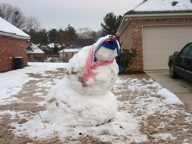 poor snowman this morning. Look at his arm sticking up out of the ground haha!