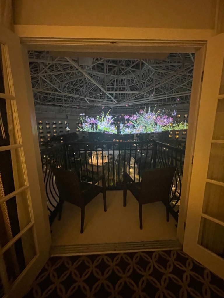 A kaleidoscope of color paints the atrium ceiling when the sun goes down, as newly upgraded and animated light curtains fill the sky with brightly blooming flowers, richly hued rabbits, springtime shooting stars, and other symbols of the season. This was so fun to see from our balcony! It was nice that it went on all evening so you didn’t have to worry about being back at a certain time or you “miss it!”