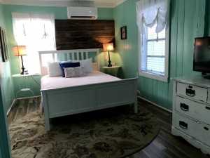 These two rooms are inn rooms but are also connecting. They each have a queen bed as well as fridge and coffee maker. There is storage space in the little back hallway and a TV.