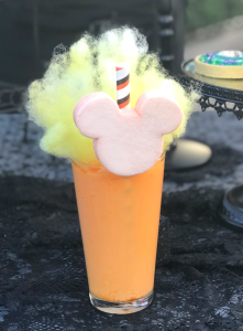 Candy corn milkshake with cotton candy and Mickey marshmallow: